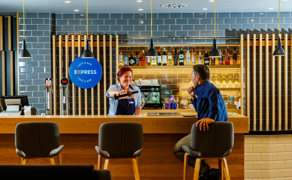 Puede disfrutarlo cómodamente en la barra o en los sofás, junto a ellos encontrará un pequeño rincón de lectura e intercambio de libros, y el espacio de acceso a internet. Puede acompañar su consumición con cualquier selección del vending.